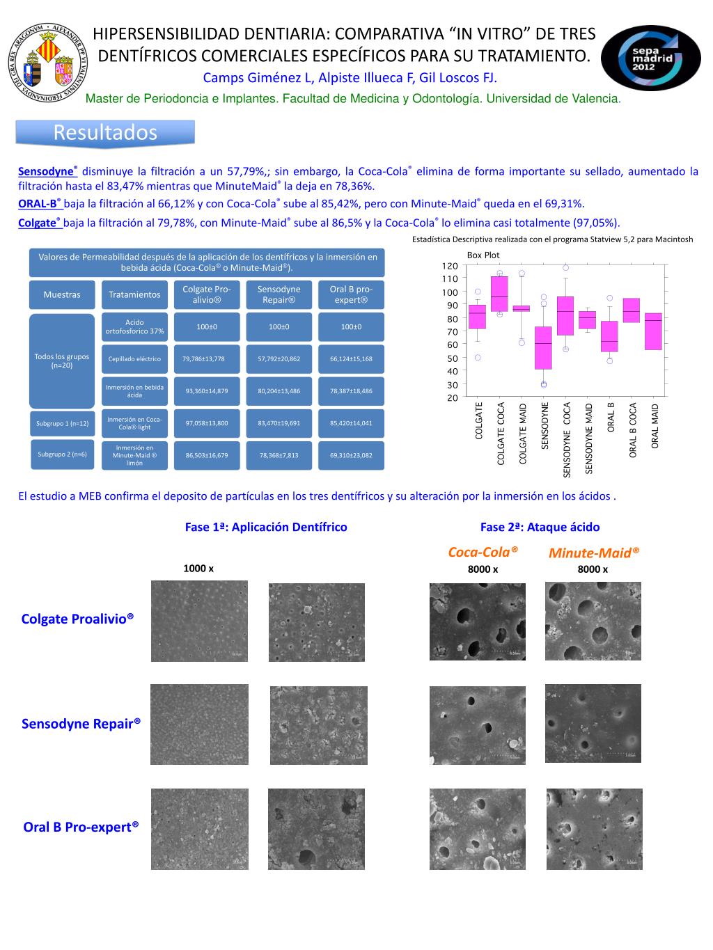 Camps Giménez L, Alpiste IlluecaF, Gil Loscos FJ. Resultados Sensodyne® disminuye la filtración a un 57,79%,; sin embargo, la Coca-Cola® elimina de forma importante su sellado, aumentado la filtración hasta el 83,47% mientras que MinuteMaid® la deja en 78,36%. ORAL-B®baja la filtración al 66,12% y con Coca-Cola® sube al 85,42%, pero con Minute-Maid® queda en el 69,31%. Colgate®baja la filtración al 79,78%, con Minute-Maid® sube al 86,5% y la Coca-Cola® lo elimina casi totalmente (97,05%). Estadística Descriptiva realizada con el programa Statview 5,2 para Macintosh HIPERSENSIBILIDAD DENTIARIA: COMPARATIVA “IN VITRO” DE TRES DENTÍFRICOS COMERCIALES ESPECÍFICOS PARA SU TRATAMIENTO. El estudio a MEB confirma el deposito de partículas en los tres dentífricos y su alteración por la inmersión en los ácidos . 7 Fase 1ª: Aplicación Dentífrico Fase 2ª: Ataque ácido Master de Periodoncia e Implantes. Facultad de Medicina y Odontología. Universidad de Valencia. Coca-Cola® Minute-Maid® 1000 x 8000 x 8000 x Colgate Proalivio® SensodyneRepair® Oral B Pro-expert®
