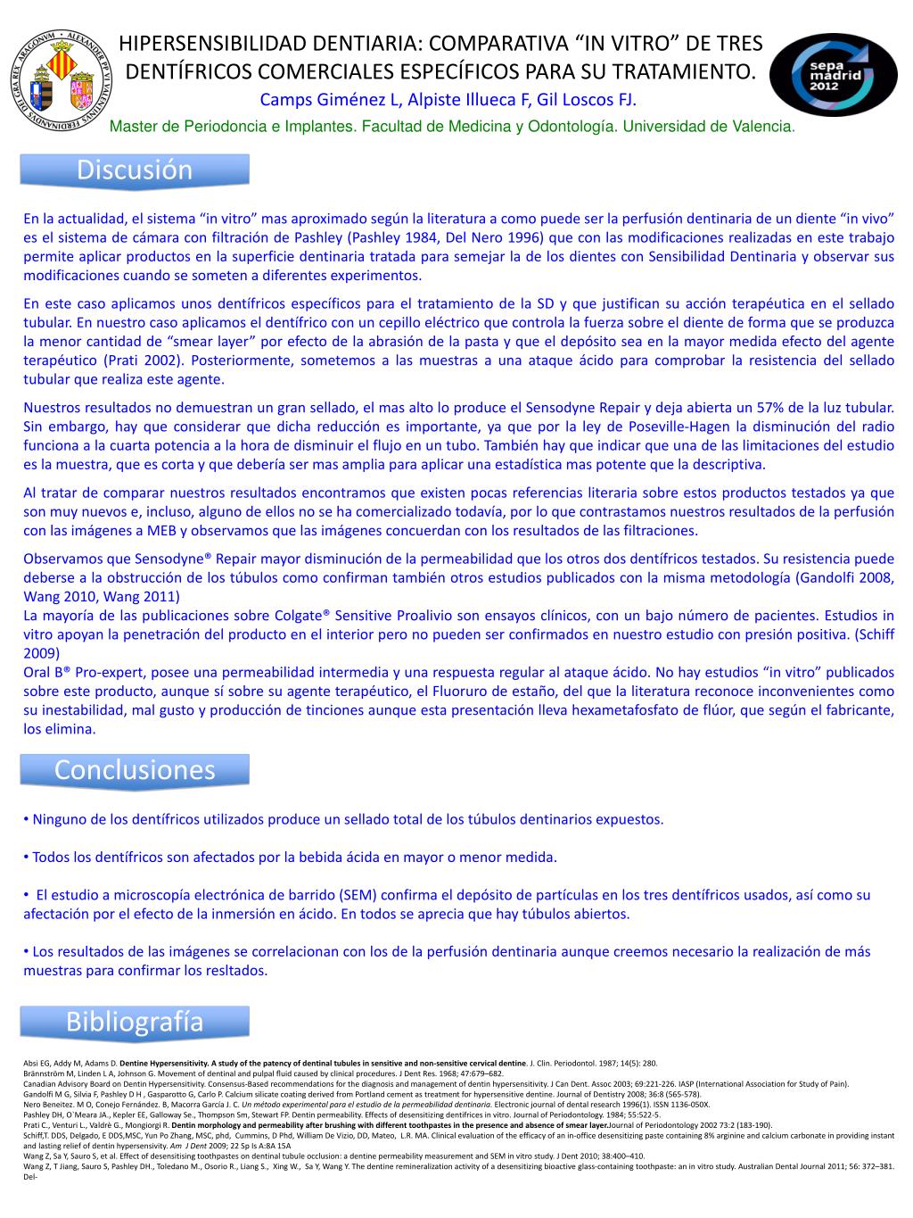 Camps Giménez L, Alpiste IlluecaF, Gil Loscos FJ. Discusión En la actualidad, el sistema “in vitro” mas aproximado según la literatura a como puede ser la perfusión dentinaria de un diente “in vivo” es el sistema de cámara con filtración de Pashley (Pashley 1984, Del Nero 1996) que con las modificaciones realizadas en este trabajo permite aplicar productos en la superficie dentinaria tratada para semejar la de los dientes con Sensibilidad Dentinaria y observar sus modificaciones cuando se someten a diferentes experimentos. En este caso aplicamos unos dentífricos específicos para el tratamiento de la SD y que justifican su acción terapéutica en el sellado tubular. En nuestro caso aplicamos el dentífrico con un cepillo eléctrico que controla la fuerza sobre el diente de forma que se produzca la menor cantidad de “smearlayer” por efecto de la abrasión de la pasta y que el depósito sea en la mayor medida efecto del agente terapéutico (Prati 2002). Posteriormente, sometemos a las muestras a una ataque ácido para comprobar la resistencia del sellado tubular que realiza este agente. Nuestros resultados no demuestran un gran sellado, el mas alto lo produce el SensodyneRepair y deja abierta un 57% de la luz tubular. Sin embargo, hay que considerar que dicha reducción es importante, ya que por la ley de Poseville-Hagen la disminución del radio funciona a la cuarta potencia a la hora de disminuir el flujo en un tubo. También hay que indicar que una de las limitaciones del estudio es la muestra, que es corta y que debería ser mas amplia para aplicar una estadística mas potente que la descriptiva. Al tratar de comparar nuestros resultados encontramos que existen pocas referencias literaria sobre estos productos testados ya que son muy nuevos e, incluso, alguno de ellos no se ha comercializado todavía, por lo que contrastamos nuestros resultados de la perfusión con las imágenes a MEB y observamos que las imágenes concuerdan con los resultados de las filtraciones. Observamos que Sensodyne® Repair mayor disminución de la permeabilidad que los otros dos dentífricos testados. Su resistencia puede deberse a la obstrucción de los túbulos como confirman también otros estudios publicados con la misma metodología (Gandolfi 2008, Wang 2010, Wang 2011) La mayoría de las publicaciones sobre Colgate® SensitiveProalivio son ensayos clínicos, con un bajo número de pacientes. Estudios in vitro apoyan la penetración del producto en el interior pero no pueden ser confirmados en nuestro estudio con presión positiva. (Schiff 2009) Oral B® Pro-expert, posee una permeabilidad intermedia y una respuesta regular al ataque ácido. No hay estudios “in vitro” publicados sobre este producto, aunque sí sobre su agente terapéutico, el Fluoruro de estaño, del que la literatura reconoce inconvenientes como su inestabilidad, mal gusto y producción de tinciones aunque esta presentación lleva hexametafosfatode flúor, que según el fabricante, los elimina. HIPERSENSIBILIDAD DENTIARIA: COMPARATIVA “IN VITRO” DE TRES DENTÍFRICOS COMERCIALES ESPECÍFICOS PARA SU TRATAMIENTO. Master de Periodoncia e Implantes. Facultad de Medicina y Odontología. Universidad de Valencia. Conclusiones • Ninguno de los dentífricos utilizados produce un sellado total de los túbulos dentinariosexpuestos. • Todos los dentífricos son afectados por la bebida ácida en mayor o menor medida. • El estudio a microscopía electrónica de barrido (SEM) confirma el depósito de partículas en los tres dentífricos usados, así como su afectación por el efecto de la inmersión en ácido. En todos se aprecia que hay túbulos abiertos. • Los resultados de las imágenes se correlacionan con los de la perfusión dentinaria aunque creemos necesario la realización de más muestras para confirmar los resltados. Bibliografía • Absi EG, Addy M, Adams D. Dentine Hypersensitivity. A study of the patency of dentinal tubules in sensitive and non-sensitive cervical dentine. J. Clin. Periodontol. 1987; 14(5): 280. • BrännströmM, Linden L A, Johnson G. Movement of dentinal and pulpal fluid caused by clinical procedures. J Dent Res. 1968; 47:679–682. • Canadian Advisory Board on Dentin Hypersensitivity. Consensus-Based recommendations for the diagnosis and management of dentin hypersensitivity. J Can Dent. Assoc 2003; 69:221-226. IASP (International Association for Study of Pain). • Gandolfi M G, Silvia F, Pashley D H , Gasparotto G, Carlo P. Calcium silicate coating derived from Portland cement as treatment for hypersensitive dentine. Journal of Dentistry 2008; 36:8 (565-578). • Nero Beneitez. M O, Conejo Fernández. B, Macorra García J. C. Un método experimental para el estudio de la permeabilidad dentinaria.Electronicjournal of dental research 1996(1). ISSN 1136-050X. • Pashley DH, O`Meara JA., Kepler EE, Galloway Se., Thompson Sm, Stewart FP. Dentin permeability. Effects of desensitizing dentifrices in vitro. Journal of Periodontology. 1984; 55:522-5. • Prati C., Venturi L., Valdrè G., Mongiorgi R. Dentin morphology and permeability after brushing with different toothpastes in the presence and absence of smear layer.Journal of Periodontology 2002 73:2 (183-190). • Schiff,T. DDS, Delgado, E DDS,MSC, Yun Po Zhang, MSC, phd, Cummins, D Phd, William De Vizio, DD, Mateo, L.R. MA. Clinical evaluation of the efficacy of an in-office desensitizing paste containing 8% arginine and calcium carbonate in providing instant and lasting relief of dentin hypersensivity. Am J Dent 2009; 22 Sp Is A:8A 15A • Wang Z, Sa Y, Sauro S, et al. Effect of desensitising toothpastes on dentinal tubule occlusion: a dentine permeability measurement and SEM in vitro study. J Dent 2010; 38:400–410. • Wang Z, T Jiang, Sauro S, Pashley DH., Toledano M., Osorio R., Liang S., Xing W., Sa Y, Wang Y. The dentine remineralization activity of a desensitizing bioactive glass-containing toothpaste: an in vitro study. Au