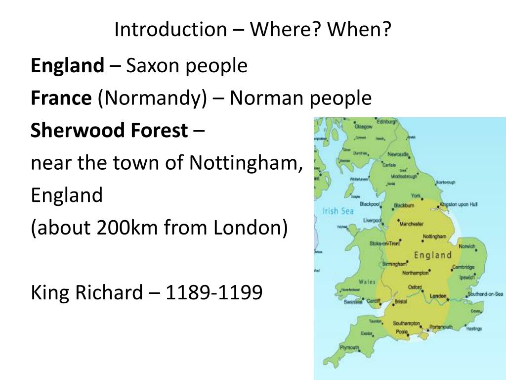Introduction – Where? When? England – Saxon people France(Normandy) – Norman people Sherwood Forest – near the town of Nottingham, England (about 200km from London) King Richard – 1189-1199