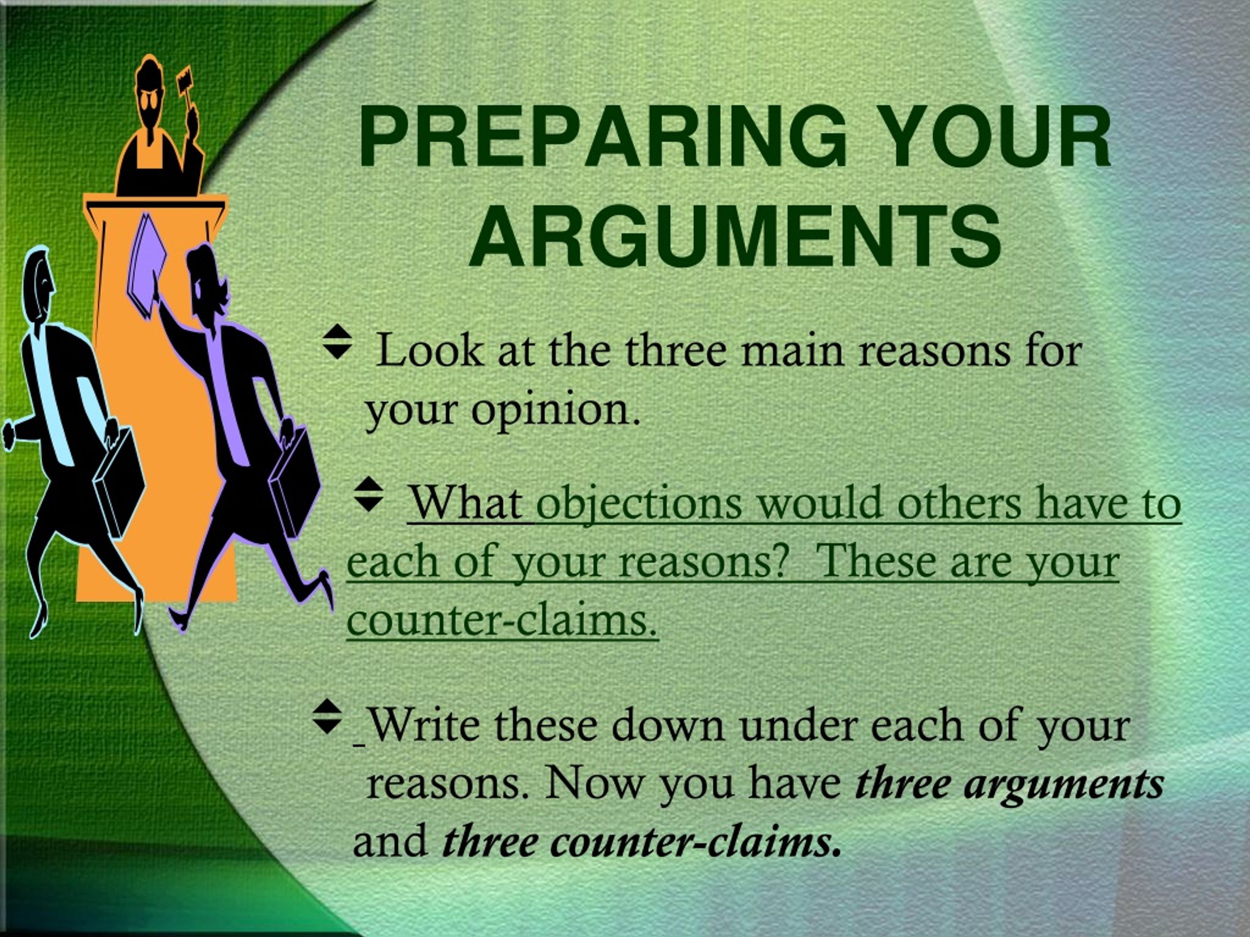 PREPARING YOUR ARGUMENTS • Look at the three main reasons for your opinion. • What objections would others have to each of your reasons? These are your counter-claims. • Write these down under each of your reasons. Now you have threearguments and three counter-claims.