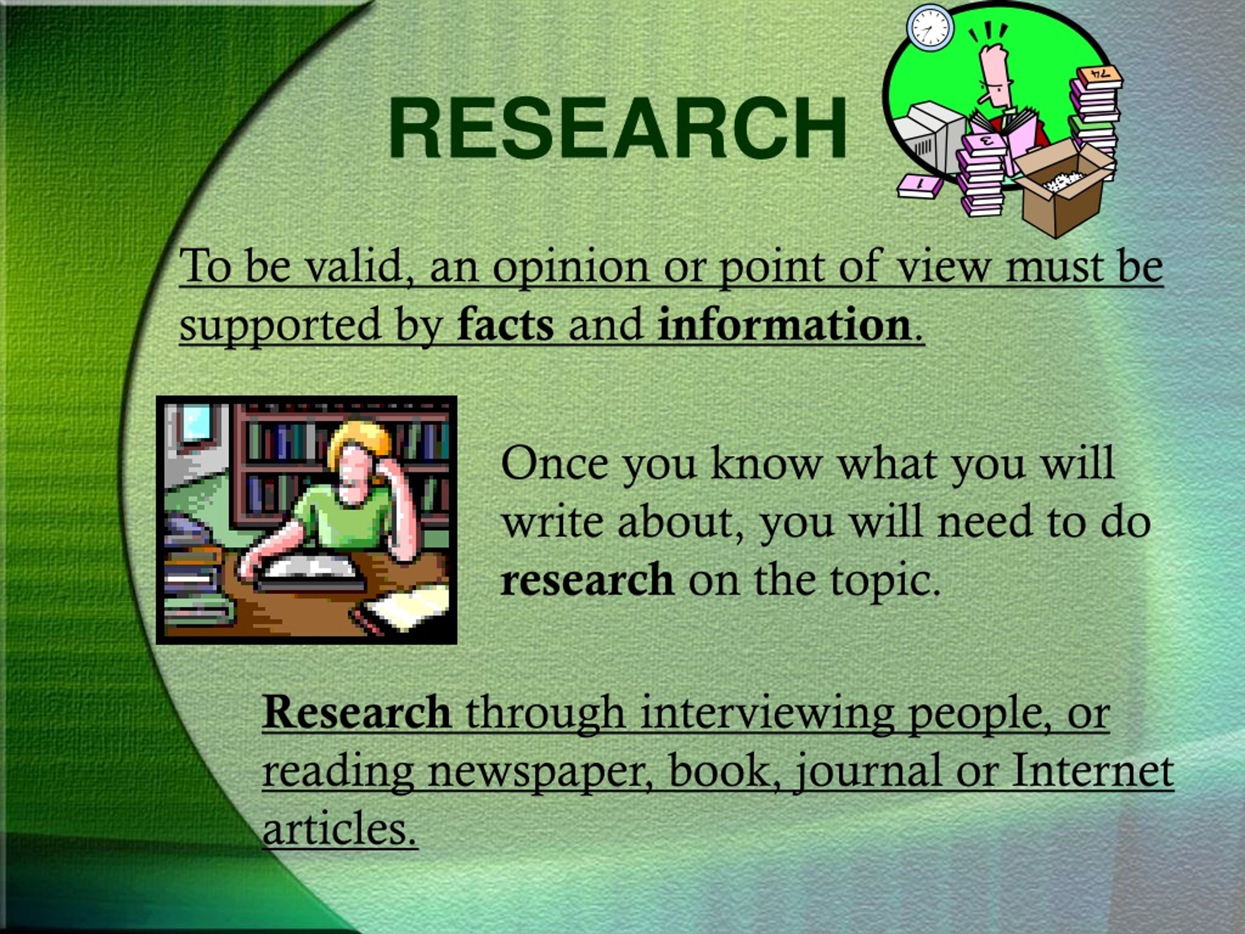 RESEARCH To be valid, an opinion or point of view must be supported by facts and information. Once you know what you will write about, you will need to do research on the topic. Research through interviewing people, orreading newspaper, book, journal or Internet articles.