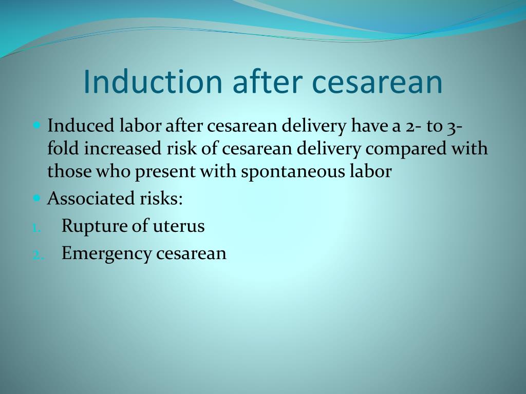 Induction after cesarean • Induced labor after cesarean delivery have a 2- to 3-fold increased risk of cesarean delivery compared with those who present with spontaneous labor • Associated risks: • Rupture of uterus • Emergency cesarean