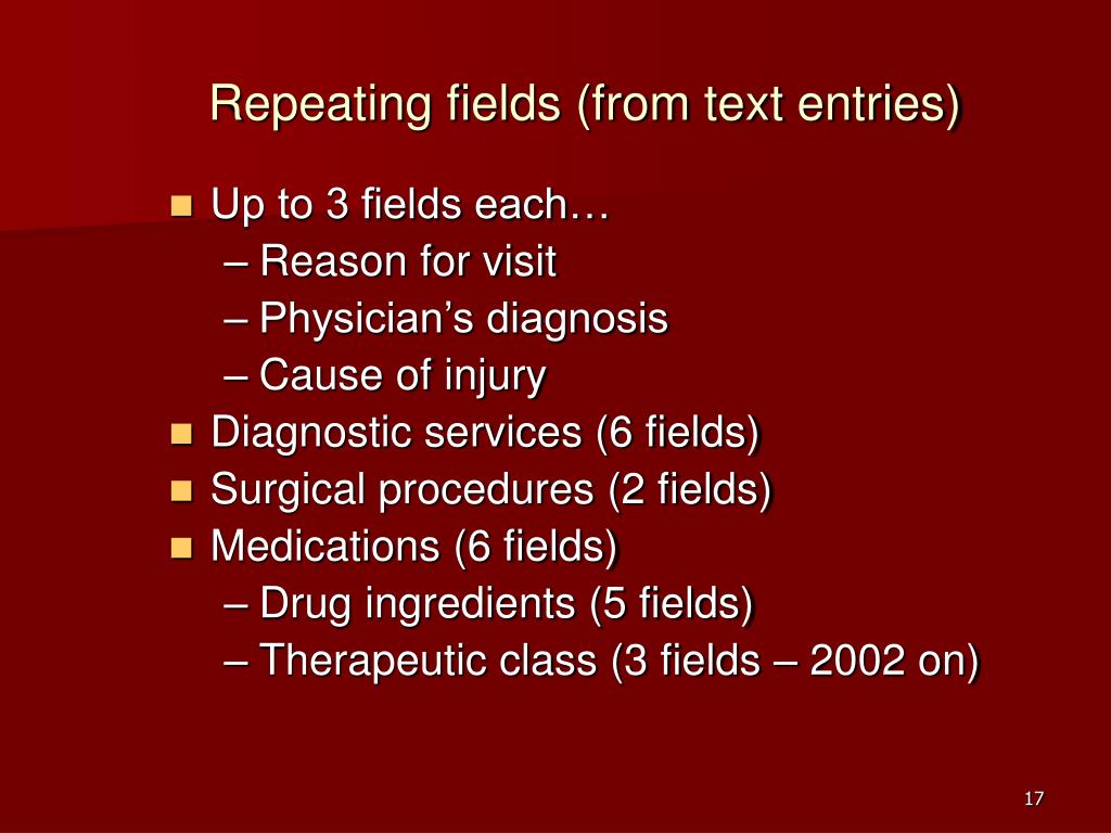 Repeating fields (from text entries) • Up to 3 fields each… • Reason for visit • Physician’s diagnosis • Cause of injury • Diagnostic services (6 fields) • Surgical procedures (2 fields) • Medications (6 fields) • Drug ingredients (5 fields) • Therapeutic class (3 fields – 2002 on)