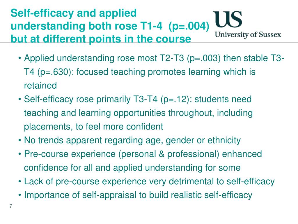 Self-efficacy and applied understanding both rose T1-4 (p=.004) but at different points in the course • Applied understanding rose most T2-T3 (p=.003) then stable T3-T4 (p=.630): focused teaching promotes learning which is retained • Self-efficacy rose primarily T3-T4 (p=.12): students need teaching and learning opportunities throughout, including placements, to feel more confident • No trends apparent regarding age, gender or ethnicity • Pre-course experience (personal & professional) enhanced confidence for all and applied understanding for some • Lack of pre-course experience very detrimental to self-efficacy • Importance of self-appraisal to build realistic self-efficacy
