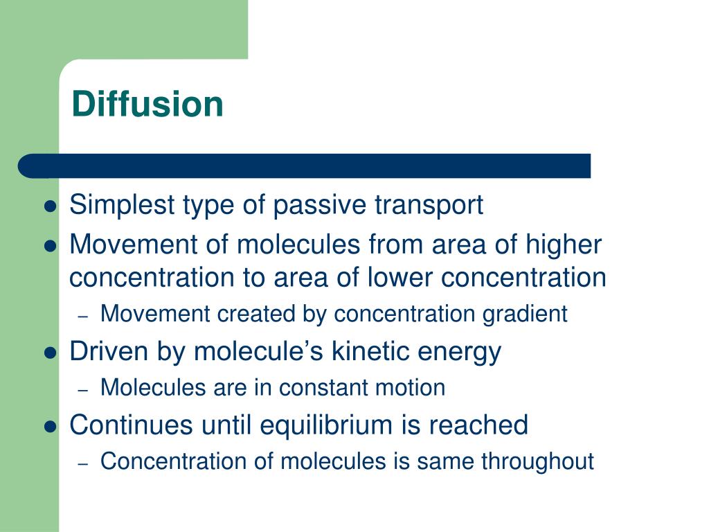 Diffusion • Simplest type of passive transport • Movement of molecules from area of higher concentration to area of lower concentration • Movement created by concentration gradient • Driven by molecule’s kinetic energy • Molecules are in constant motion • Continues until equilibrium is reached • Concentration of molecules is same throughout