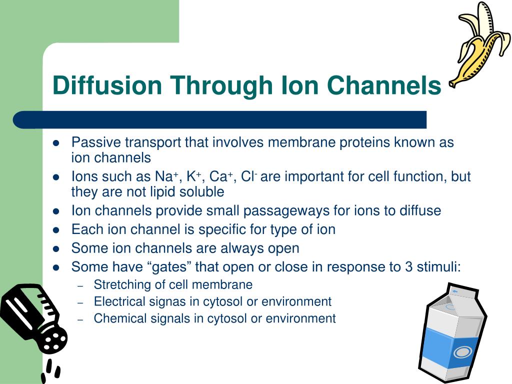 Diffusion Through Ion Channels • Passive transport that involves membrane proteins known as ion channels • Ions such as Na+, K+, Ca+, Cl- are important for cell function, but they are not lipid soluble • Ion channels provide small passageways for ions to diffuse • Each ion channel is specific for type of ion • Some ion channels are always open • Some have “gates” that open or close in response to 3 stimuli: • Stretching of cell membrane • Electrical signas in cytosol or environment • Chemical signals in cytosol or environment