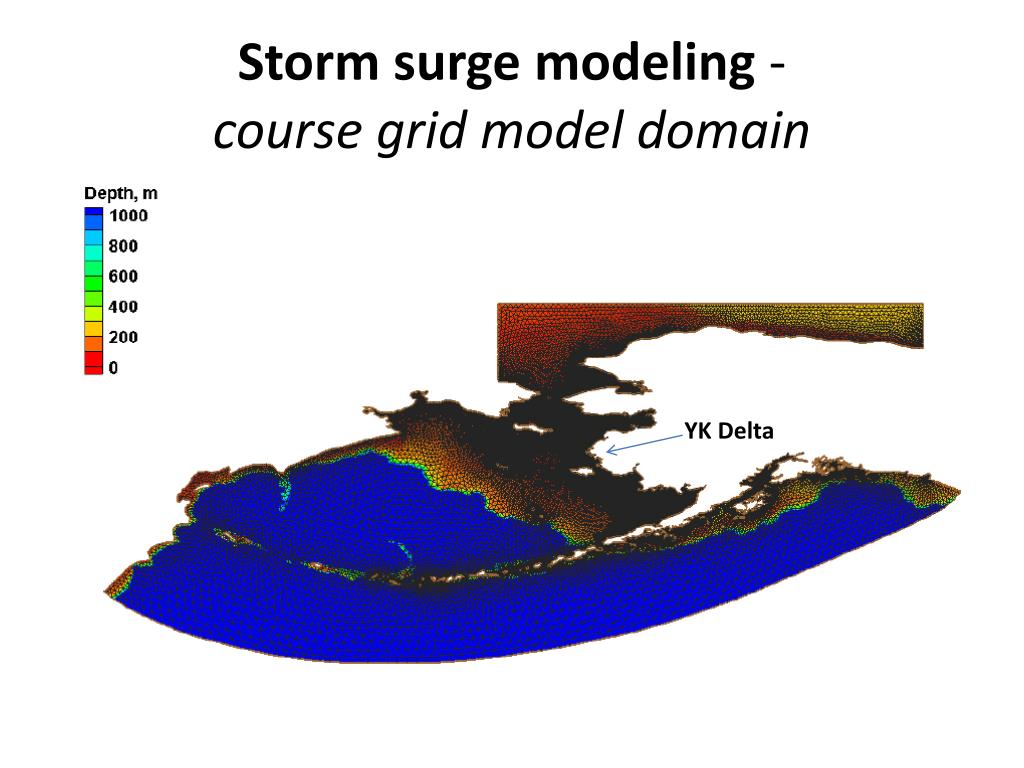 Research Goal: determine the likely change in YK Delta ecology due to storm surges – enhanced by sea level rise • Tasks: • Develop and validate a storm surge model • Identify a number of representative storms from the past 40 years • Model these storms and their inundation under present climate conditions • Re-model these storms assuming one or more sea level rise scenarios • Compute an inundation index from each model run • Compute an annual inundation index based on inundation indices from selected storms • Establish the relationship between annual index and ecological parameters (e.g., vegetation type) under present climate • Infer changes in ecological parameters (e.g., vegetation type) under a future climate based on projected changes in inundation index