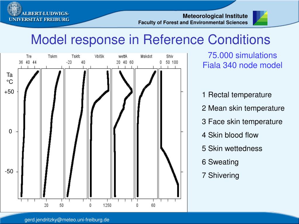 Model response in Reference Conditions 75.000 simulations Fiala 340 node model Ta °C +50 1Rectal temperature 2Mean skin temperature 3Face skin temperature 4Skin blood flow 5Skin wettedness 6Sweating 7Shivering 0 -50