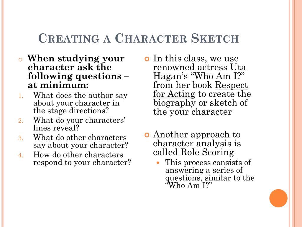 Creating a Character Sketch • When studying your character ask the following questions – at minimum: • What does the author say about your character in the stage directions? • What do your characters’ lines reveal? • What do other characters say about your character? • How do other characters respond to your character? • In this class, we use renowned actress Uta Hagan’s “Who Am I?” from her book Respect for Acting to create the biography or sketch of the your character • Another approach to character analysis is called Role Scoring • This process consists of answering a series of questions, similar to the “Who Am I?”