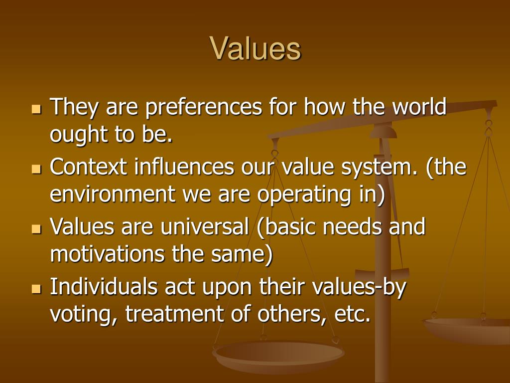 Values • They are preferences for how the world ought to be. • Context influences our value system. (the environment we are operating in) • Values are universal (basic needs and motivations the same) • Individuals act upon their values-by voting, treatment of others, etc.