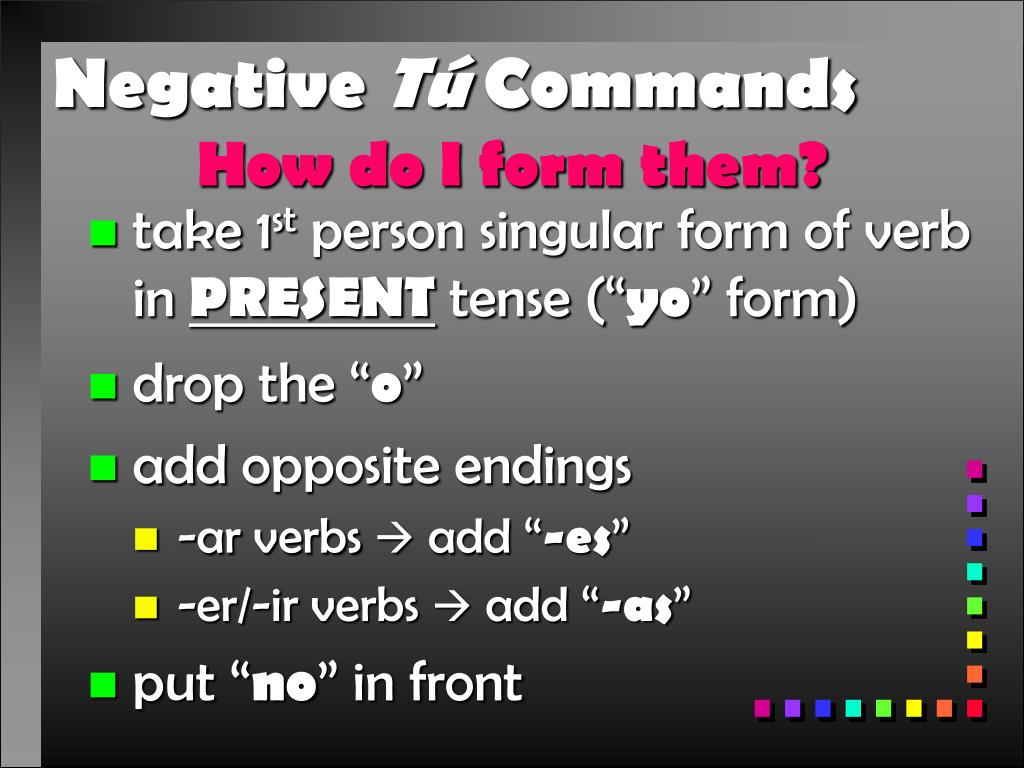 Negative Tú Commands How do I form them? • take 1st person singular form of verb in PRESENT tense (“yo” form) • drop the “o” • add opposite endings • -ar verbs add “-es” • -er/-ir verbs add “-as” • put “no” in front