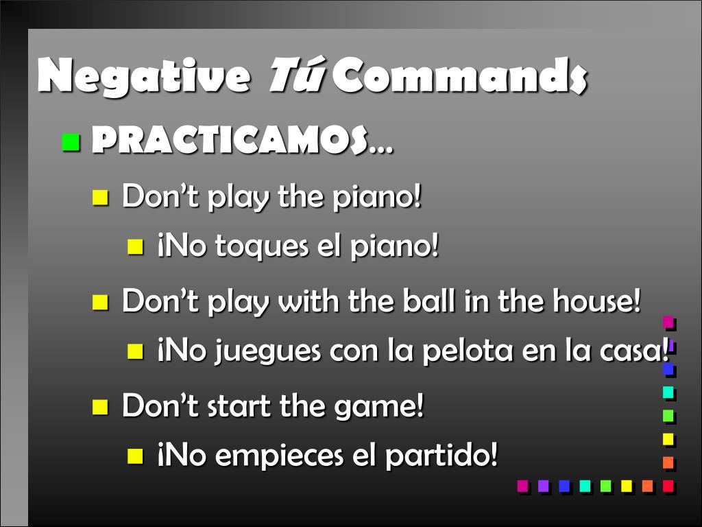 Negative Tú Commands • PRACTICAMOS… • Don’t play the piano! • ¡No toques el piano! • Don’t play with the ball in the house! • ¡No juegues con la pelota en la casa! • Don’t start the game! • ¡No empieces el partido!