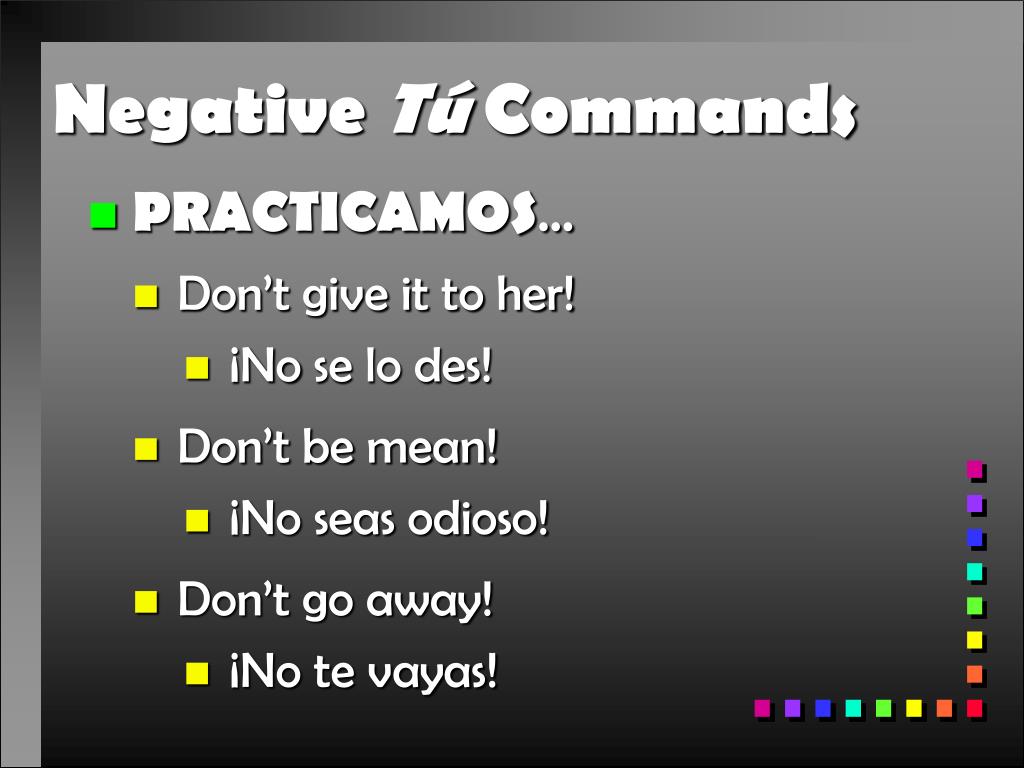 Negative Tú Commands • PRACTICAMOS… • Don’t give it to her! • ¡No se lo des! • Don’t be mean! • ¡No seas odioso! • Don’t go away! • ¡No te vayas!