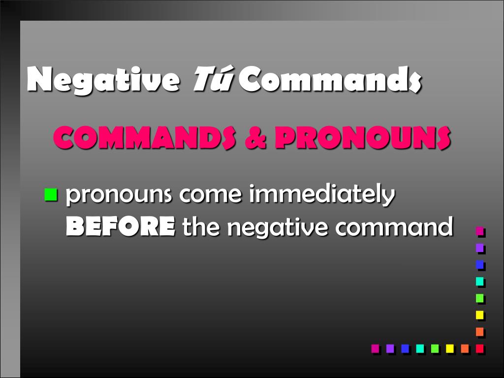 Negative Tú Commands COMMANDS & PRONOUNS • pronouns come immediately BEFORE the negative command