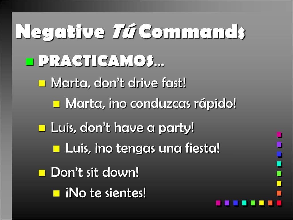 Negative Tú Commands • PRACTICAMOS… • Marta, don’t drive fast! • Marta, ¡no conduzcas rápido! • Luis, don’t have a party! • Luis, ¡no tengas una fiesta! • Don’t sit down! • ¡No te sientes!