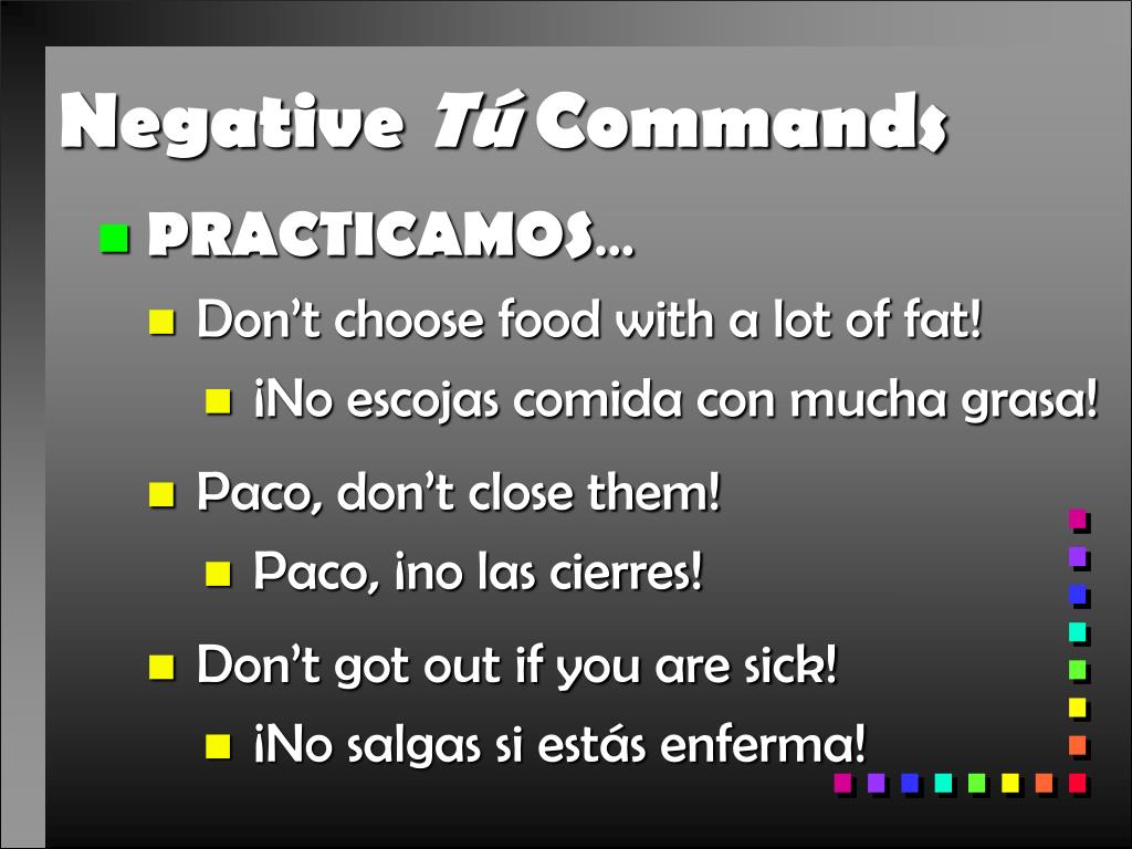 Negative Tú Commands • PRACTICAMOS… • Don’t choose food with a lot of fat! • ¡No escojas comida con mucha grasa! • Paco, don’t close them! • Paco, ¡no las cierres! • Don’t got out if you are sick! • ¡No salgas si estás enferma!