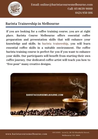Email: online@baristacoursemelbourne.com Call: 03 8639 9000 0424 950 106 Barista Traineeship in Melbourne If you are looking for a coffee training course, you are at right place. Barista Course Melbourne offers essential coffee preparation and presentation skills that will enhance your knowledge and skills. In barista traineeship, you will learn essential coffee skills in a suitable environment. The coffee barista training course is perfect for you if you want to enhance your skills. Our participants will benefit from starting their own coffee journey. Our dedicated coffee artist will teach you how to “free pour” many creative designs. Level 2, 28-32 Elizabeth Street, LOCATION: www.baristacoursemelbourne.com Melbourne VIC 3000