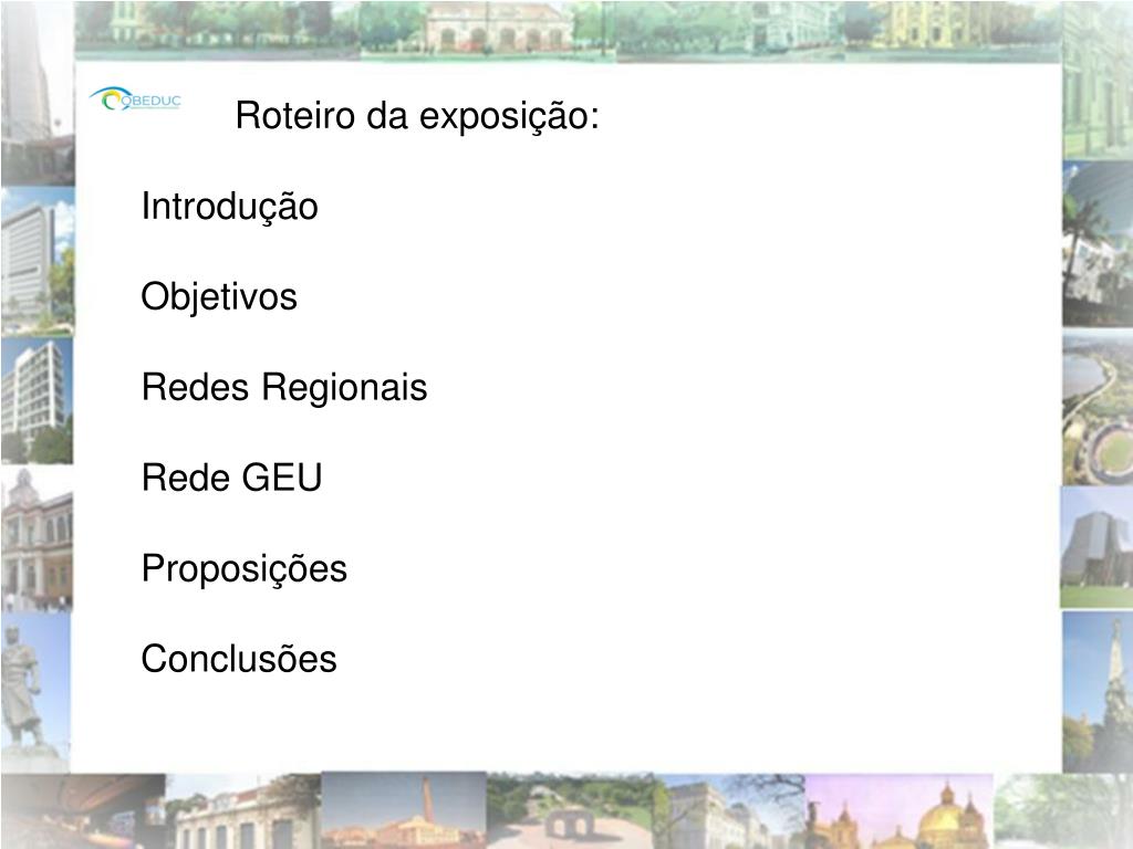 Roteiro da exposição: Introdução Objetivos Redes Regionais Rede GEU Proposições Conclusões