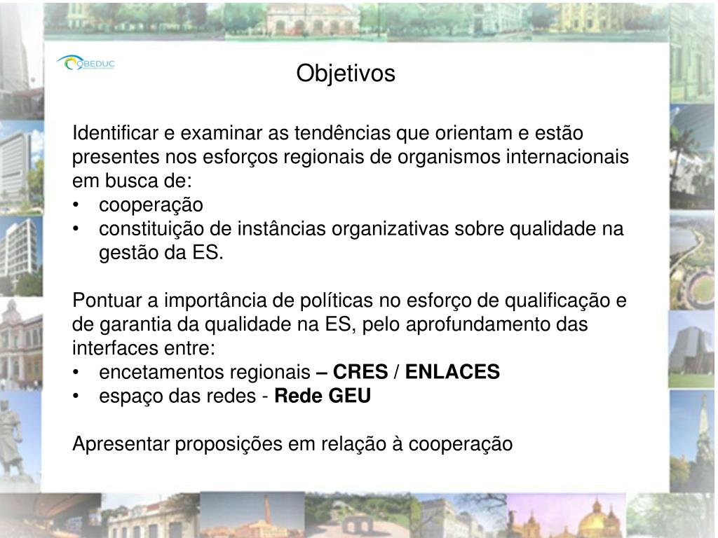 Objetivos • Identificar e examinar as tendências que orientam e estão presentes nos esforços regionais de organismos internacionais em busca de: • cooperação • constituição de instâncias organizativas sobre qualidade na gestão da ES. • Pontuar a importância de políticas no esforço de qualificação e de garantia da qualidade na ES, pelo aprofundamento das interfaces entre: • encetamentos regionais – CRES / ENLACES • espaço das redes - Rede GEU • Apresentar proposições em relação à cooperação