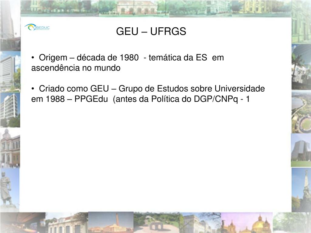 GEU – UFRGS • Origem – década de 1980 - temática da ES em ascendência no mundo • Criado como GEU – Grupo de Estudos sobre Universidade em 1988 – PPGEdu (antes da Política do DGP/CNPq - 1
