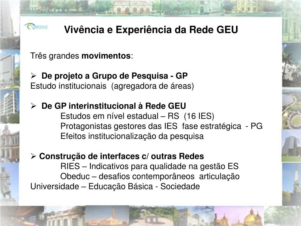 Vivência e Experiência da Rede GEU • Três grandes movimentos: • De projeto a Grupo de Pesquisa - GP • Estudo institucionais (agregadora de áreas) • De GP interinstitucional à Rede GEU • Estudos em nível estadual – RS (16 IES) • Protagonistas gestores das IES fase estratégica - PG • Efeitos institucionalização da pesquisa • Construção de interfaces c/ outras Redes • RIES – Indicativos para qualidade na gestão ES • Obeduc – desafios contemporâneos articulação Universidade – Educação Básica - Sociedade