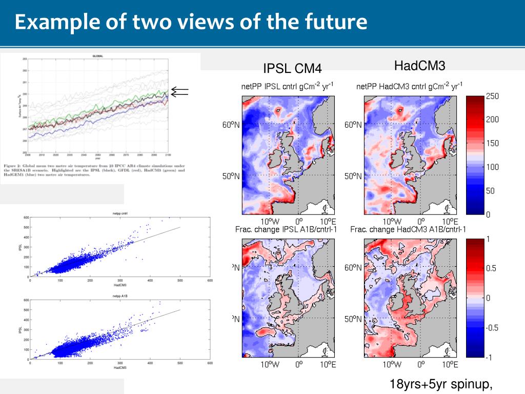 Timeslice experiments • Run for conditions in future and conditions in present and look at difference • Assumes system adjusts during a spin-up period • Must be long enough to ‘average out’ natural variability • Assumes statistics are stationary during timeslice In this case: Natural variability a real issue Spin-up ok for temp., maybe not for nutrients/benthic etc 30yrs