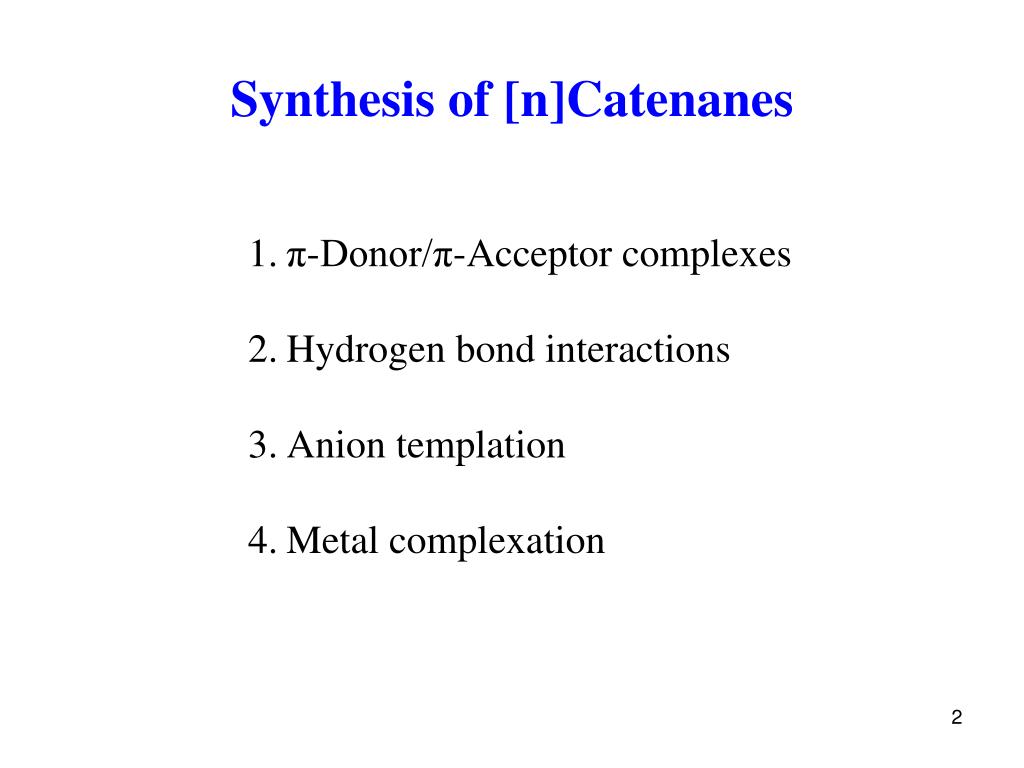 Synthesis of [n]Catenanes • π-Donor/π-Acceptor complexes • Hydrogen bond interactions • Anion templation • Metal complexation
