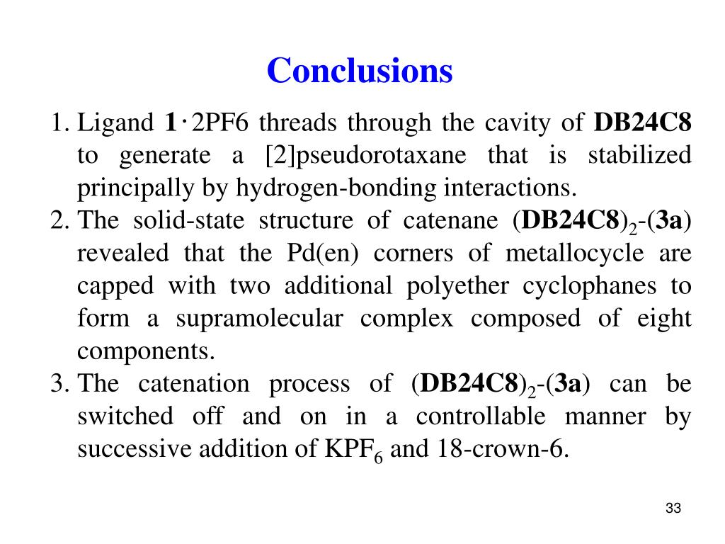 Conclusions • Ligand 1‧2PF6 threads through the cavity of DB24C8 to generate a [2]pseudorotaxane that is stabilized principally by hydrogen-bonding interactions. • The solid-state structure of catenane (DB24C8)2-(3a) revealed that the Pd(en) corners of metallocycle are capped with two additional polyether cyclophanes to form a supramolecular complex composed of eight components. • The catenation process of (DB24C8)2-(3a) can be switched off and on in a controllable manner by successive addition of KPF6 and 18-crown-6.