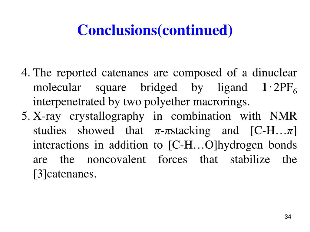 Conclusions(continued) • The reported catenanes are composed of a dinuclear molecular square bridged by ligand 1‧2PF6 interpenetrated by two polyether macrorings. • X-ray crystallography in combination with NMR studies showed that π-πstacking and [C-H…π] interactions in addition to [C-H…O]hydrogen bonds are the noncovalent forces that stabilize the [3]catenanes.