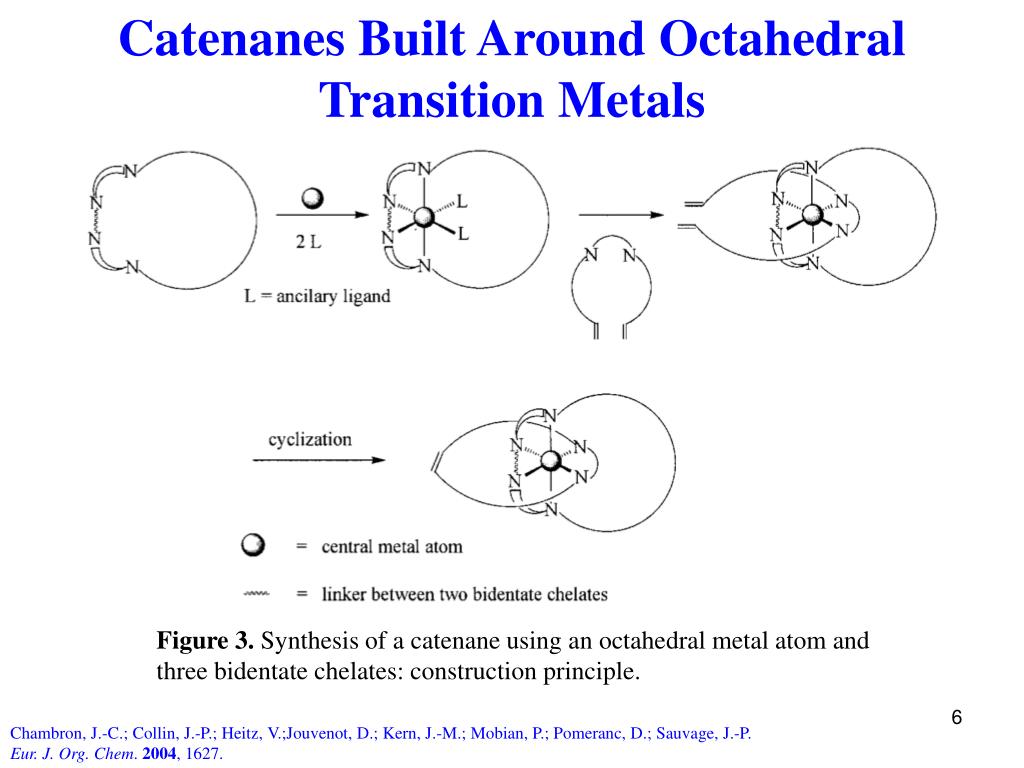 Catenanes Built Around Octahedral Transition Metals Figure 3. Synthesis of a catenane using an octahedral metal atom and three bidentate chelates: construction principle. Chambron, J.-C.; Collin, J.-P.; Heitz, V.;Jouvenot, D.; Kern, J.-M.; Mobian, P.; Pomeranc, D.; Sauvage, J.-P. Eur. J. Org. Chem. 2004, 1627.