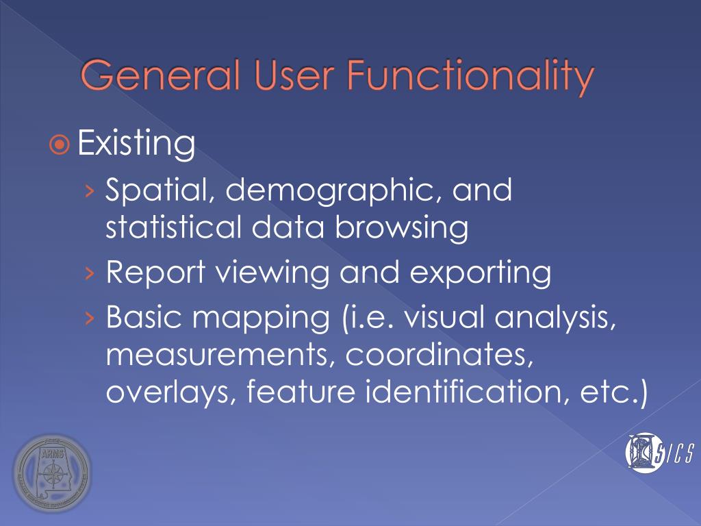 General User Functionality • Existing • Spatial, demographic, and statistical data browsing • Report viewing and exporting • Basic mapping (i.e. visual analysis, measurements, coordinates, overlays, feature identification, etc.)