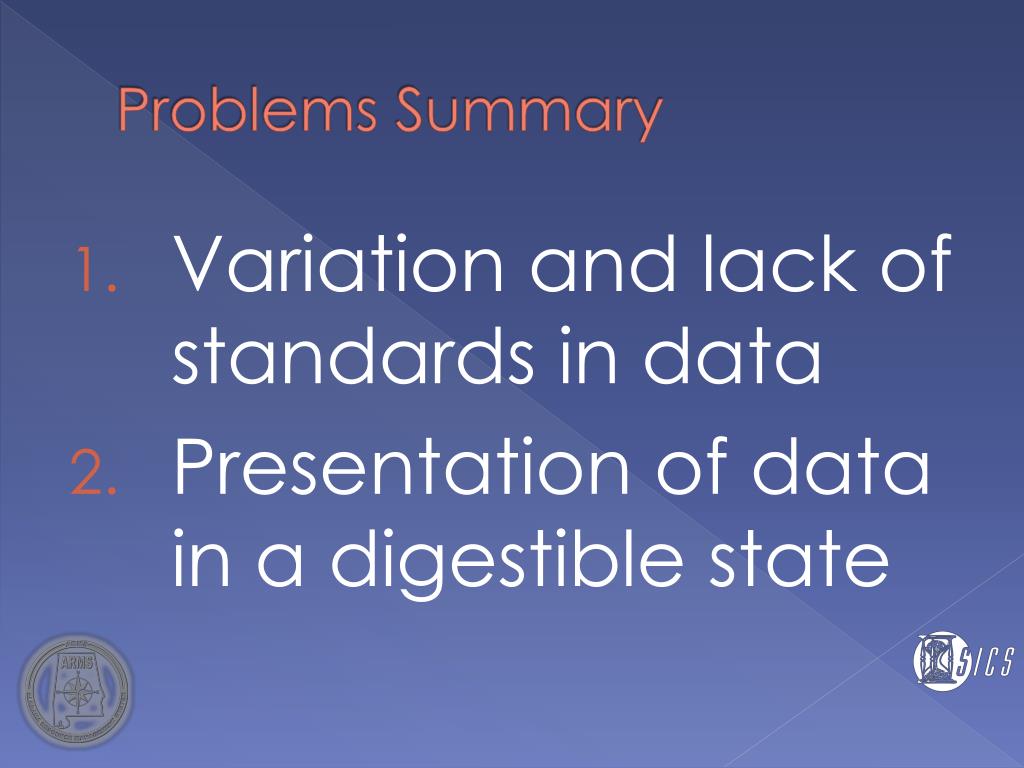 Problems Summary • Variation and lack of standards in data • Presentation of data in a digestible state