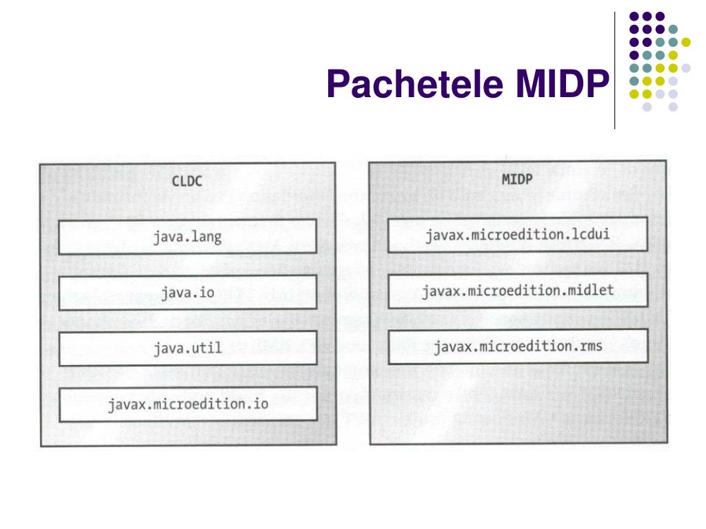 Mobile Information Device Profile (MIDP) • Dispozitive cu astfel de caracteristici sunt telefoane mobile, anumite pagere, anumite PDA-uri. • API-ul disponibil unei aplicatii MIDP este format din pachetele din CLDC si MIDP