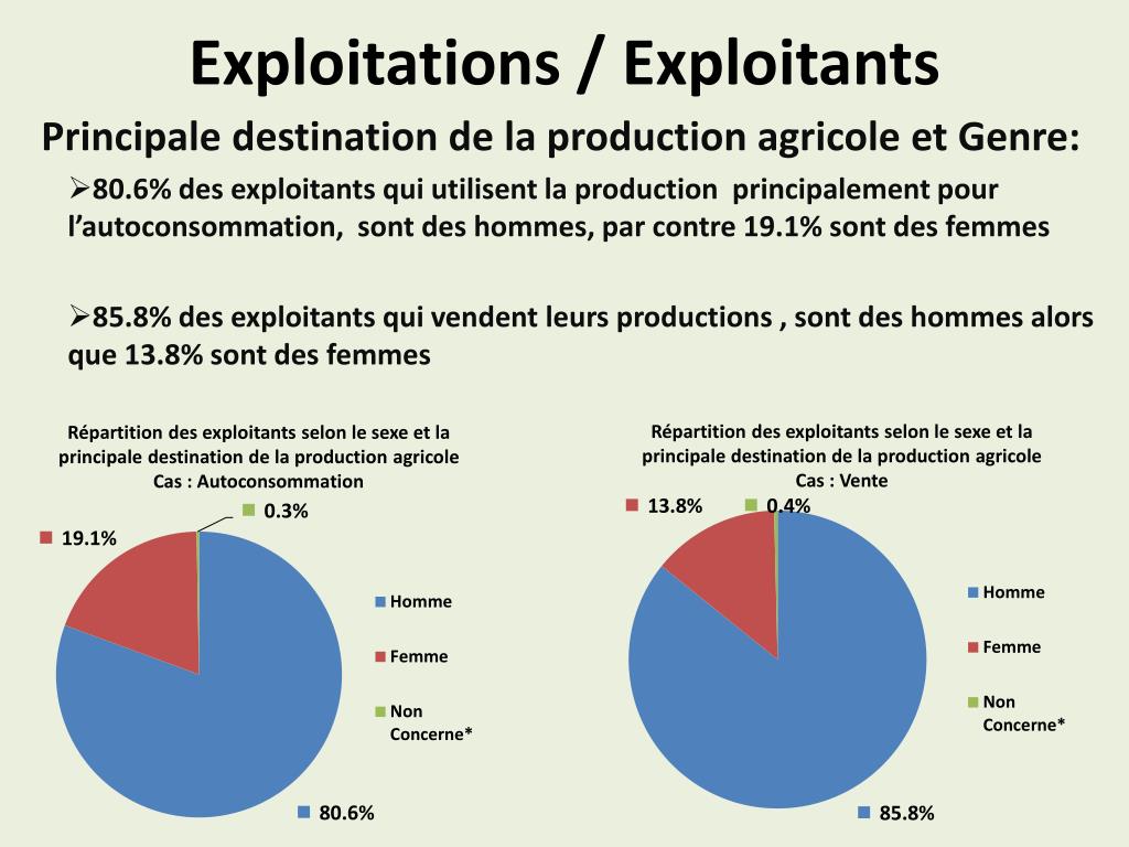 Exploitations / Exploitants Répartition des exploitants selon le sexe et la principale destination de la production agricole Cas : Vente Répartition des exploitants selon le sexe et la principale destination de la production agricole Cas : Autoconsommation Principale destination de la production agricole et Genre: 80.6% des exploitants qui utilisent la production principalement pour l’autoconsommation, sont des hommes, par contre 19.1% sont des femmes 85.8% des exploitants qui vendent leurs productions , sont des hommes alors que 13.8% sont des femmes