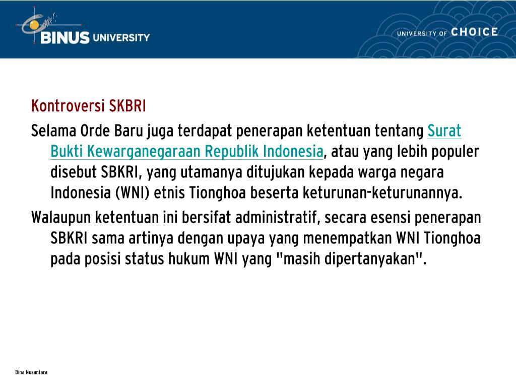 Kontroversi SKBRI Selama Orde Baru juga terdapat penerapan ketentuan tentang Surat Bukti Kewarganegaraan Republik Indonesia, atau yang lebih populer disebut SBKRI, yang utamanya ditujukan kepada warga negara Indonesia (WNI) etnis Tionghoa beserta keturunan-keturunannya. Walaupun ketentuan ini bersifat administratif, secara esensi penerapan SBKRI sama artinya dengan upaya yang menempatkan WNI Tionghoa pada posisi status hukum WNI yang "masih dipertanyakan".