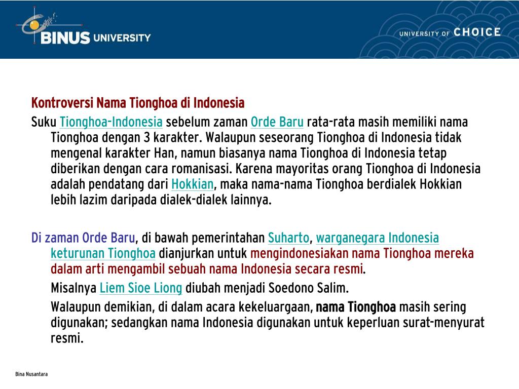 Kontroversi Nama Tionghoa di Indonesia Suku Tionghoa-Indonesia sebelum zaman Orde Baru rata-rata masih memiliki nama Tionghoa dengan 3 karakter. Walaupun seseorang Tionghoa di Indonesia tidak mengenal karakter Han, namun biasanya nama Tionghoa di Indonesia tetap diberikan dengan cara romanisasi. Karena mayoritas orang Tionghoa di Indonesia adalah pendatang dari Hokkian, maka nama-nama Tionghoa berdialek Hokkian lebih lazim daripada dialek-dialek lainnya. Di zaman Orde Baru, di bawah pemerintahan Suharto, warganegara Indonesia keturunan Tionghoa dianjurkan untuk mengindonesiakan nama Tionghoa mereka dalam arti mengambil sebuah nama Indonesia secara resmi. Misalnya Liem Sioe Liong diubah menjadi Soedono Salim. Walaupun demikian, di dalam acara kekeluargaan, nama Tionghoa masih sering digunakan; sedangkan nama Indonesia digunakan untuk keperluan surat-menyurat resmi.