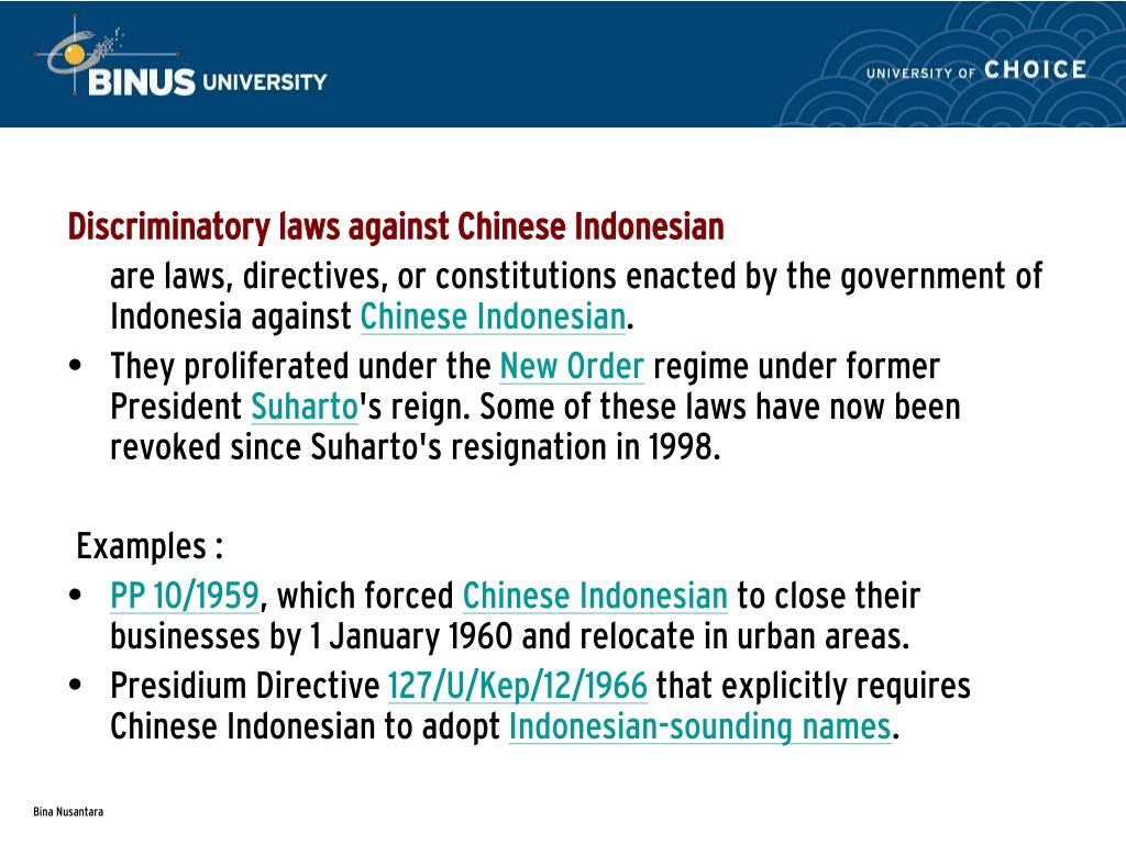 Discriminatory laws against Chinese Indonesian are laws, directives, or constitutions enacted by the government of Indonesia against Chinese Indonesian. • They proliferated under the New Order regime under former President Suharto's reign. Some of these laws have now been revoked since Suharto's resignation in 1998. Examples : • PP 10/1959, which forced Chinese Indonesian to close their businesses by 1 January 1960 and relocate in urban areas. • Presidium Directive 127/U/Kep/12/1966 that explicitly requires Chinese Indonesian to adopt Indonesian-sounding names.