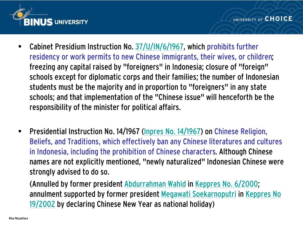 Cabinet Presidium Instruction No. 37/U/IN/6/1967, which prohibits further residency or work permits to new Chinese immigrants, their wives, or children; freezing any capital raised by "foreigners" in Indonesia; closure of "foreign" schools except for diplomatic corps and their families; the number of Indonesian students must be the majority and in proportion to "foreigners" in any state schools; and that implementation of the "Chinese issue" will henceforth be the responsibility of the minister for political affairs. • Presidential Instruction No. 14/1967 (Inpres No. 14/1967) on Chinese Religion, Beliefs, and Traditions,which effectively ban any Chinese literatures and cultures in Indonesia, including the prohibition of Chinese characters. Although Chinese names are not explicitly mentioned, "newly naturalized" Indonesian Chinese were strongly advised to do so. (Annulled by former president Abdurrahman Wahid in Keppres No. 6/2000; annulment supported by former president Megawati Soekarnoputri in Keppres No 19/2002 by declaring Chinese New Year as national holiday)