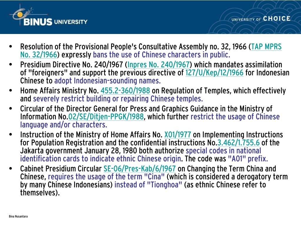Resolution of the Provisional People's Consultative Assembly no. 32, 1966 (TAP MPRS No. 32/1966) expressly bans the use of Chinese characters in public. • Presidium Directive No. 240/1967 (Inpres No. 240/1967) which mandates assimilation of "foreigners" and support the previous directive of 127/U/Kep/12/1966 for Indonesian Chinese to adopt Indonesian-sounding names. • Home Affairs Ministry No. 455.2-360/1988 on Regulation of Temples, which effectively and severely restrict building or repairing Chinese temples. • Circular of the Director General for Press and Graphics Guidance in the Ministry of Information No.02/SE/Ditjen-PPGK/1988, which further restrict the usage of Chinese language and/or characters. • Instruction of the Ministry of Home Affairs No. X01/1977 on Implementing Instructions for Population Registration and the confidential instructions No.3.462/1.755.6 of the Jakarta government January 28, 1980 both authorize special codes in national identification cards to indicate ethnic Chinese origin. The code was "A01" prefix. • Cabinet Presidium Circular SE-06/Pres-Kab/6/1967 on Changing the Term China and Chinese, requires the usage of the term "Cina" (which is considered a derogatory term by many Chinese Indonesians) instead of "Tionghoa" (as ethnic Chinese refer to themselves).