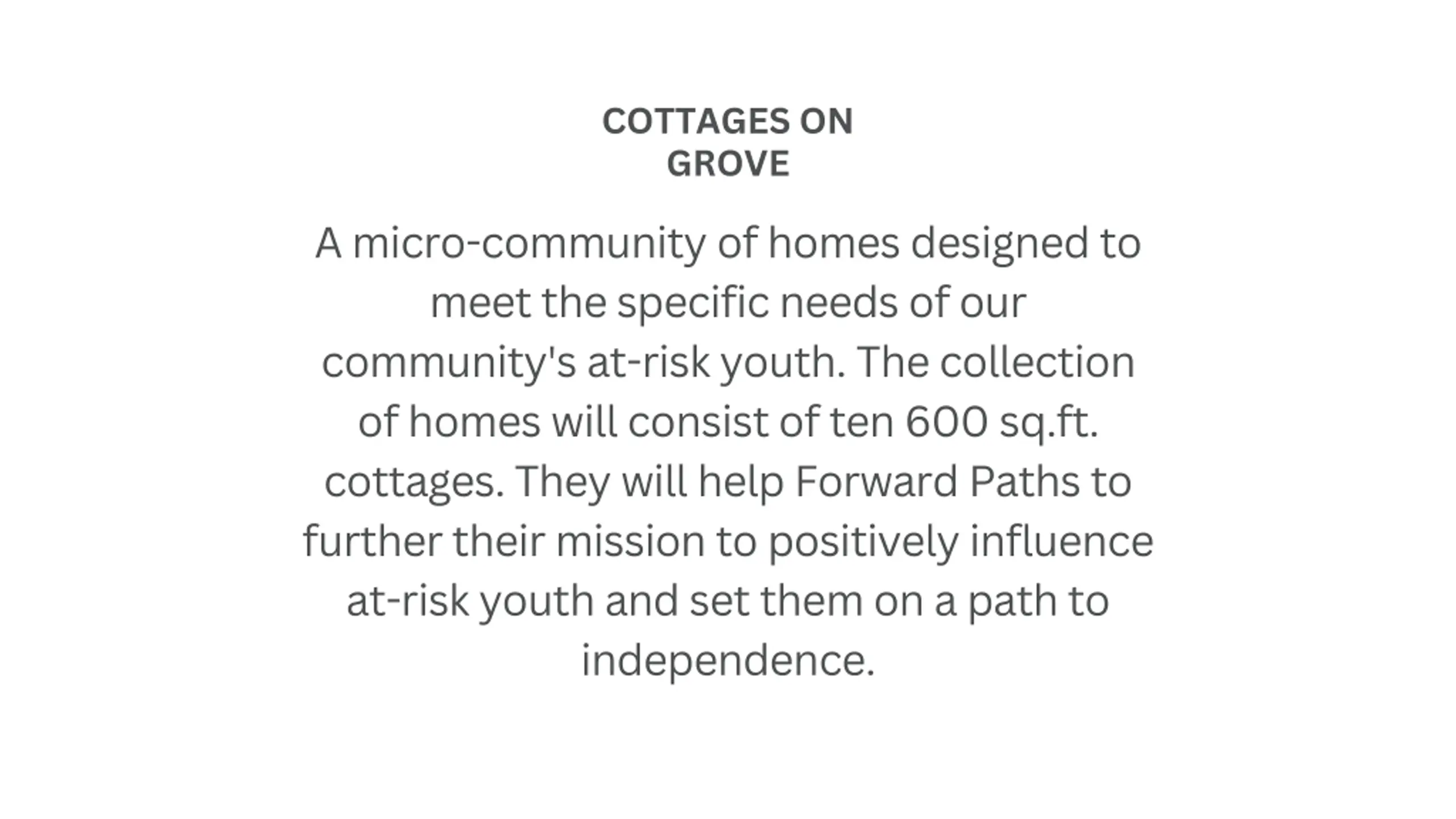 2. COTTAGES ON GROVE A micro-community of homes designed to meet the specific needs of our community's at-risk youth. The collection of homes will consist of ten 600 sq.ft. cottages. They will help Forward Paths to further their mission to positively influence at-risk youth and set them on a path to independence.
