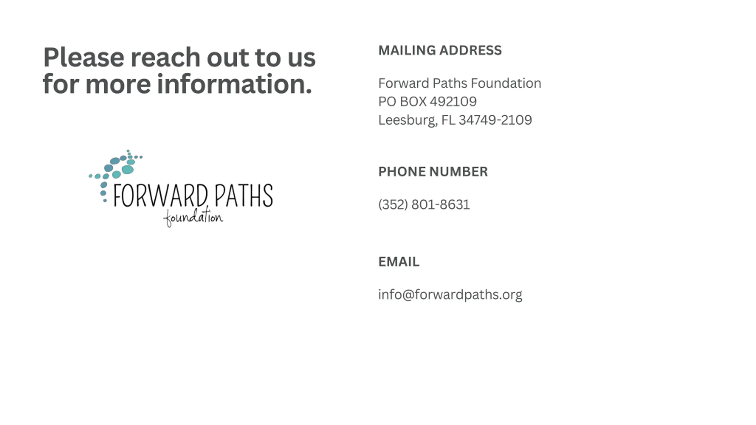 8. Please reach out to us for more information. MAILING ADDRESS Forward Paths Foundation PO BOX 492109 Leesburg, FL 34749-2109 PHONE NUMBER (352) 801-8631 EMAIL info@forwardpaths.org