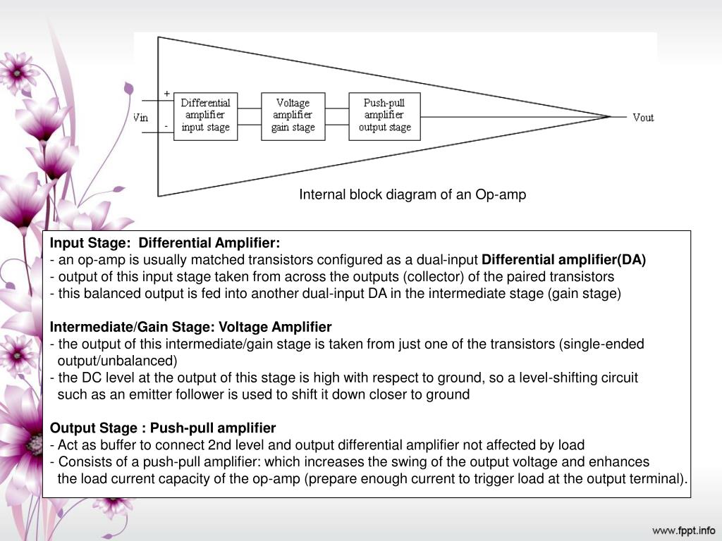 Internal block diagram of an Op-amp • Input Stage: Differential Amplifier: • an op-amp is usually matched transistors configured as a dual-input Differential amplifier(DA) • output of this input stage taken from across the outputs (collector) of the paired transistors • - this balanced output is fed into another dual-input DA in the intermediate stage (gain stage) • Intermediate/Gain Stage: Voltage Amplifier • - the output of this intermediate/gain stage is taken from just one of the transistors (single-ended • output/unbalanced) • - the DC level at the output of this stage is high with respect to ground, so a level-shifting circuit • such as an emitter follower is used to shift it down closer to ground • Output Stage : Push-pull amplifier • - Act as buffer to connect 2nd level and output differential amplifier not affected by load • - Consists of a push-pull amplifier: which increases the swing of the output voltage and enhances • the load current capacity of the op-amp (prepare enough current to trigger load at the output terminal).