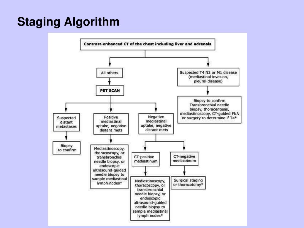 Types of Staging • Symptoms and physical findings • Laboratory tests • x-ray, CT, PET • - Mediastinal LN sampling • mediastinoscopy • thoracoscopy • endoscopic ultrasound • transbronchial needle aspiration • - Cytologic examination of pleural effusions