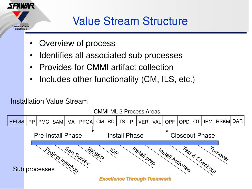 Value Stream Structure • Overview of process • Identifies all associated sub processes • Provides for CMMI artifact collection • Includes other functionality (CM, ILS, etc.) Installation Value Stream CMMI ML 3 Process Areas DAR RSKM REQM CM RD TS OT IPM PP PMC SAM MA PPQA PI VER VAL OPF OPD Pre-Install Phase Install Phase Closeout Phase IDP BESEP Turnover Site Survey Install prep Project initiation Install Activities Test & Checkout Sub processes