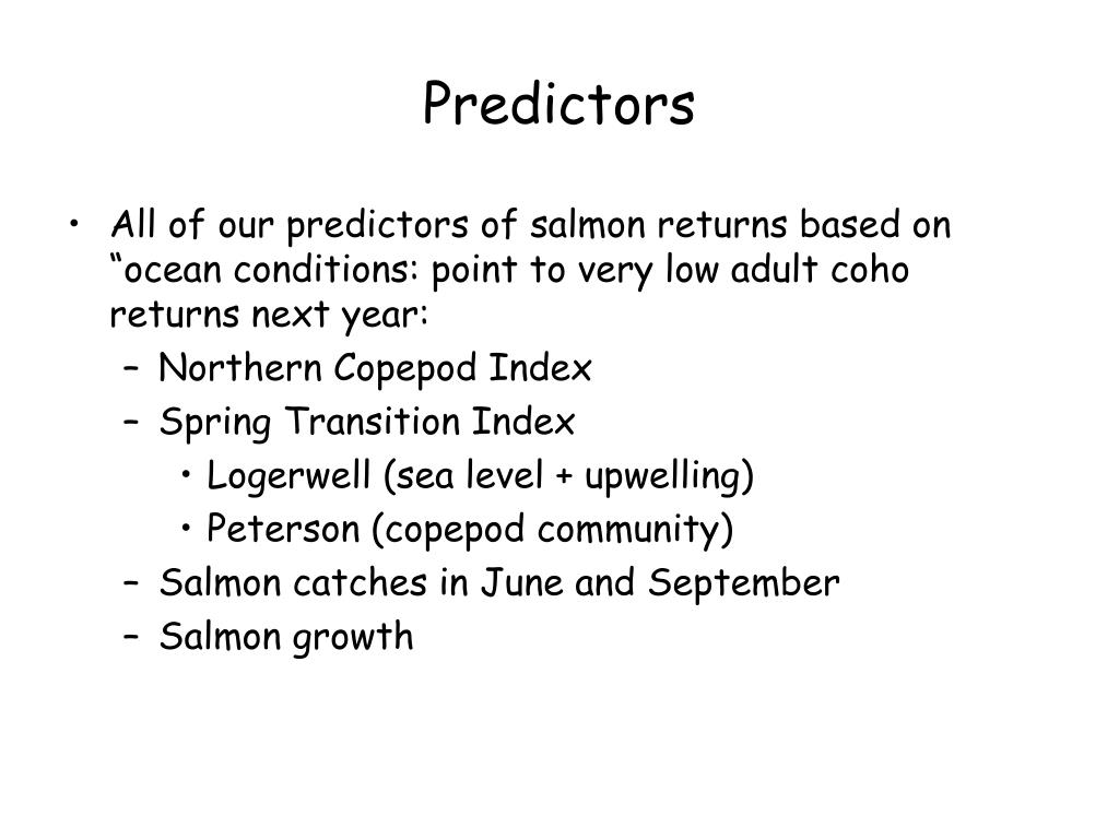 Predictors • All of our predictors of salmon returns based on “ocean conditions: point to very low adult coho returns next year: • Northern Copepod Index • Spring Transition Index • Logerwell (sea level + upwelling) • Peterson (copepod community) • Salmon catches in June and September • Salmon growth