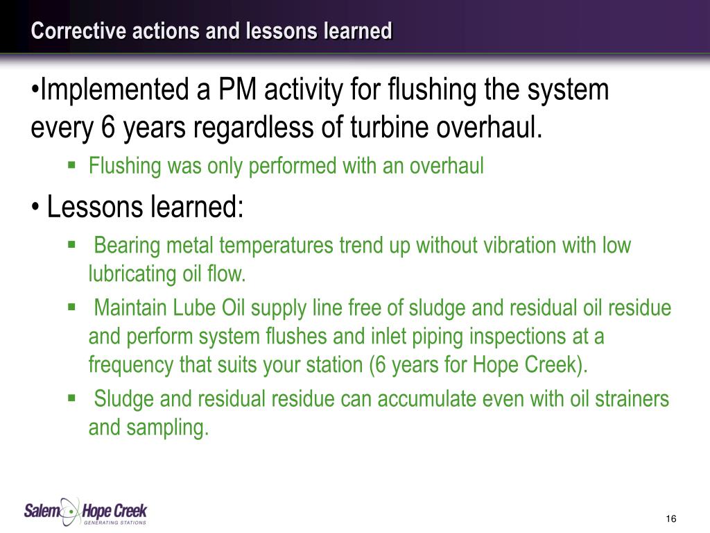 Corrective actions and lessons learned • Implemented a PM activity for flushing the system every 6 years regardless of turbine overhaul. • Flushing was only performed with an overhaul • Lessons learned: • Bearing metal temperatures trend up without vibration with low lubricating oil flow. • Maintain Lube Oil supply line free of sludge and residual oil residue and perform system flushes and inlet piping inspections at a frequency that suits your station (6 years for Hope Creek). • Sludge and residual residue can accumulate even with oil strainers and sampling.
