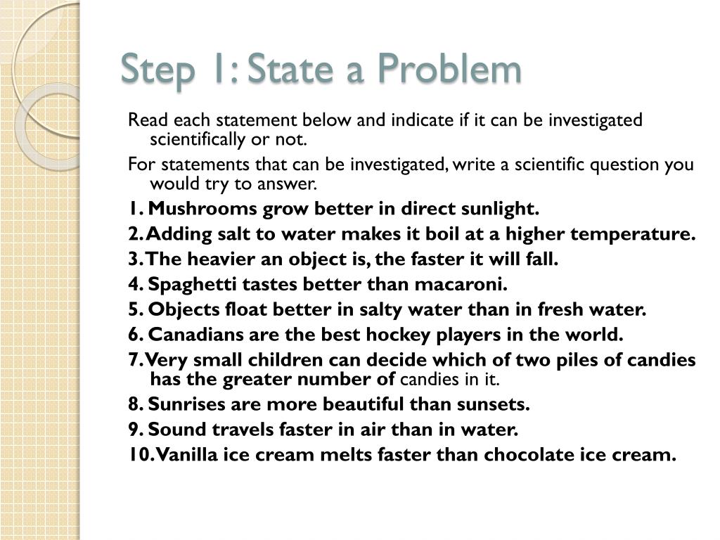 Step 1: State a Problem Read each statement below and indicate if it can be investigated scientifically or not. For statements that can be investigated, write a scientific question you would try to answer. 1. Mushrooms grow better in direct sunlight. 2. Adding salt to water makes it boil at a higher temperature. 3. The heavier an object is, the faster it will fall. 4. Spaghetti tastes better than macaroni. 5. Objects float better in salty water than in fresh water. 6. Canadians are the best hockey players in the world. 7. Very small children can decide which of two piles of candies has the greater number of candies in it. 8. Sunrises are more beautiful than sunsets. 9. Sound travels faster in air than in water. 10. Vanilla ice cream melts faster than chocolate ice cream.