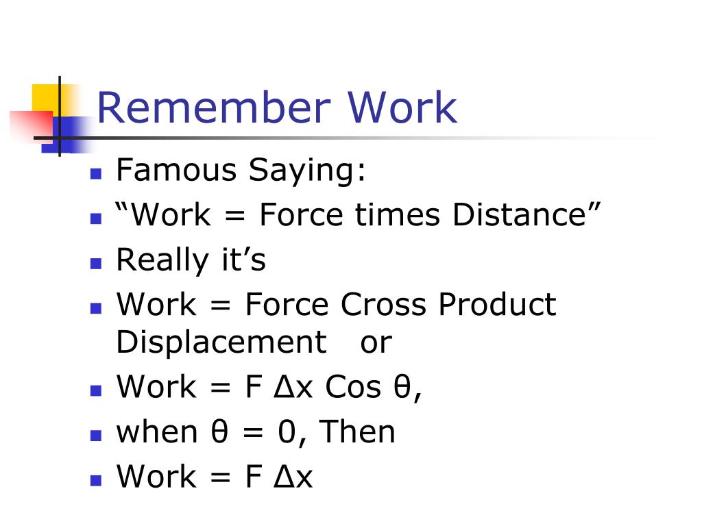 Remember Work • Famous Saying: • “Work = Force times Distance” • Really it’s • Work = Force Cross Product Displacement or • Work = F Δx Cos θ, • when θ = 0, Then • Work = F Δx