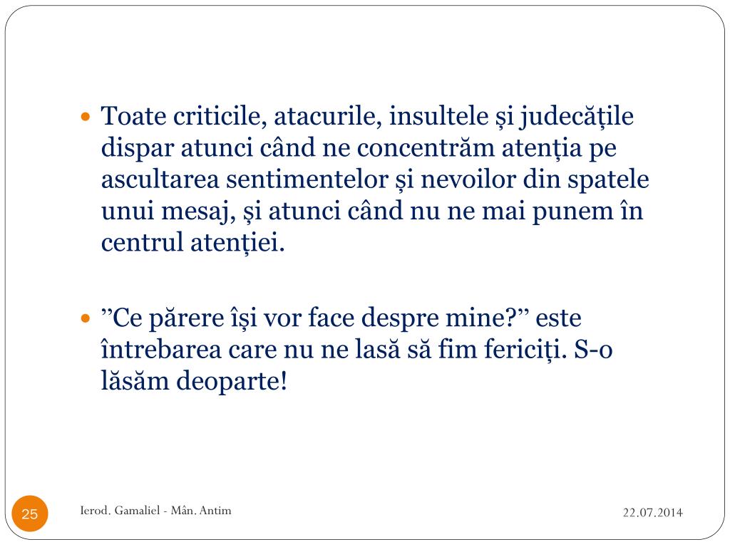 Toate criticile, atacurile, insultele și judecățile dispar atunci când ne concentrăm atenția pe ascultarea sentimentelor și nevoilor din spatele unui mesaj, și atunci când nu ne mai punem în centrul atenției. • ˮCe părere își vor face despre mine?ˮ este întrebarea care nu ne lasă să fim fericiți. S-o lăsăm deoparte! Ierod. Gamaliel - Mân. Antim