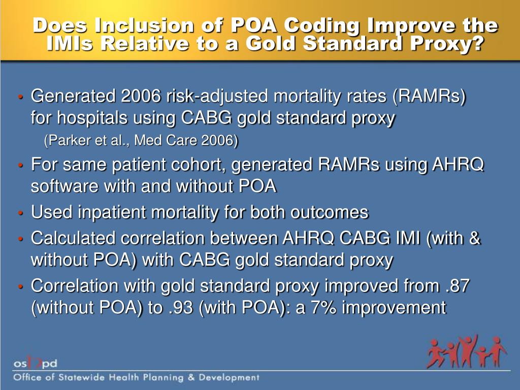 Generated 2006 risk-adjusted mortality rates (RAMRs) for hospitals using CABG gold standard proxy (Parker et al., Med Care 2006) For same patient cohort, generated RAMRs using AHRQ software with and without POA Used inpatient mortality for both outcomes Calculated correlation between AHRQ CABG IMI (with & without POA) with CABG gold standard proxy Correlation with gold standard proxy improved from .87 (without POA) to .93 (with POA): a 7% improvement Does Inclusion of POA Coding Improve the IMIs Relative to a Gold Standard Proxy?